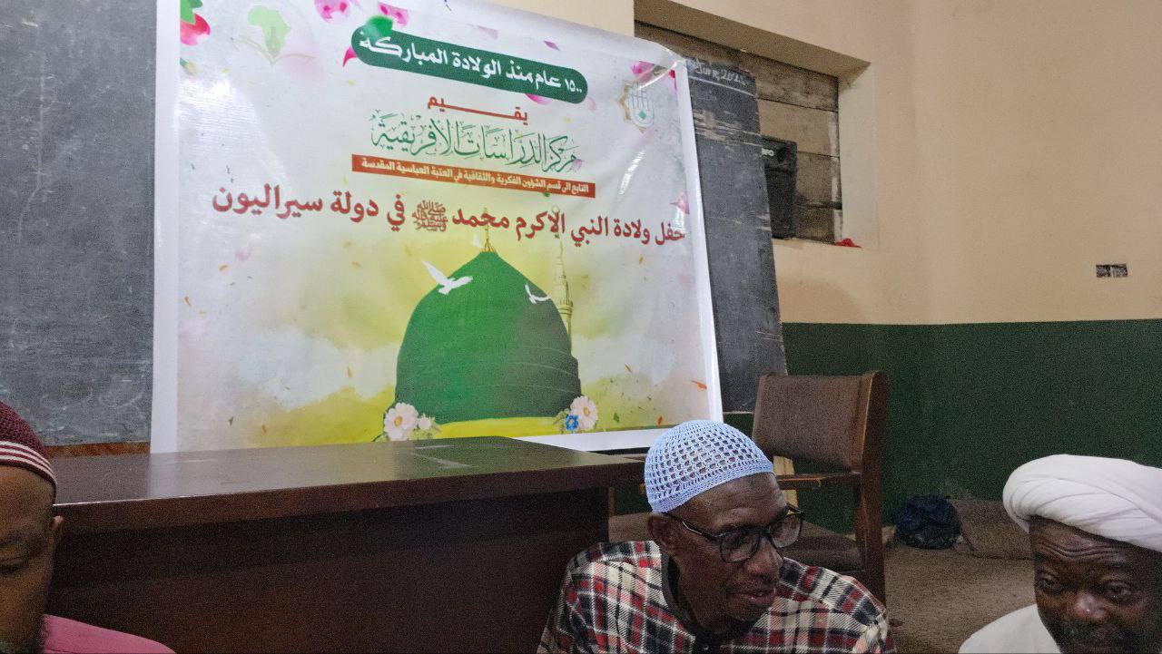 أقام مركز الدراسات الإفريقية التابع للعتبة العباسية المقدسة، من خلال منسقه الشيخ إبراهيم باح، محفلاً مباركاً بمناسبة ذكرى ولادة الرسول الأكرم ﷺ، وذلك يوم 19 ربيع الأول 1447 هـ في مدينة ديفل هول بالعاصمة السيراليونية فريتاون.